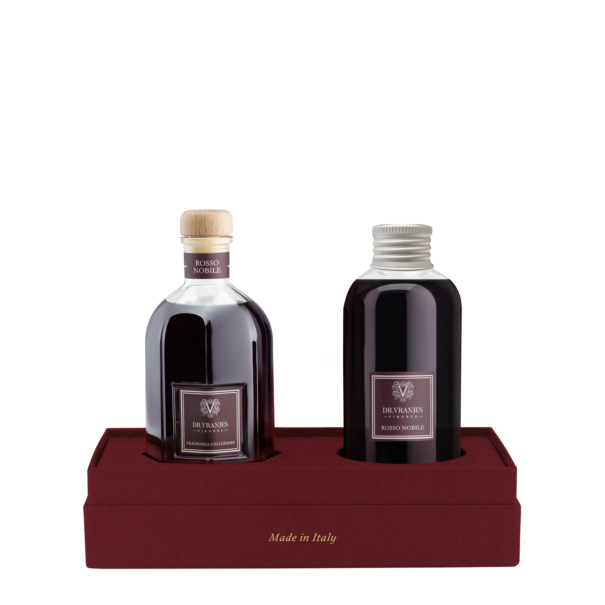 Questa elegante scatola regalo comprende Rosso Nobile 100 ml diffusore con bastoncini e ricarica da 150ml.