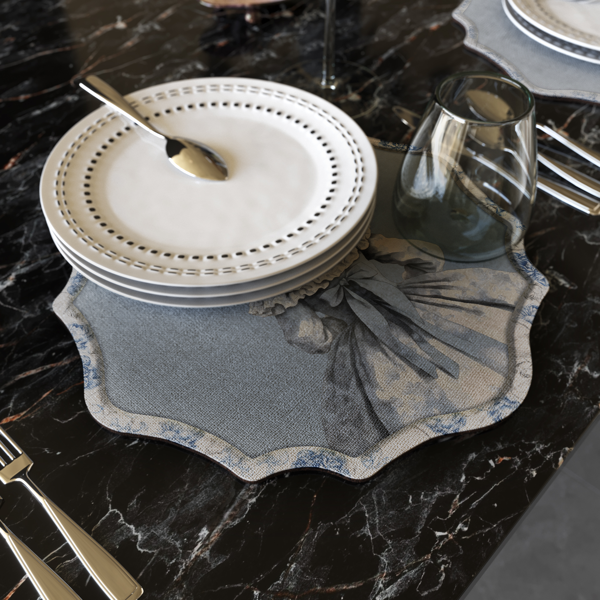 Manifattura artigianale e design si incontrano in queste creazioni uniche. Sottopiatto, realizzato con anima in MDF rivestito su 2 facce, inferiore con sughero naturale, superiore con materiale telato sintetico protetto.